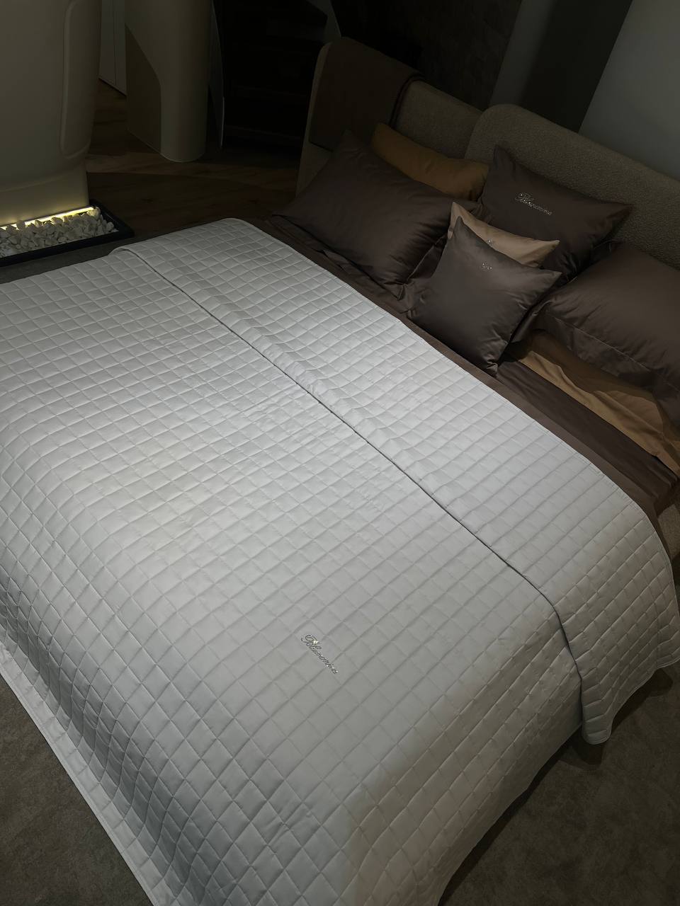Однотонне покривало Lory від Blumarine має стриманий дизайн та актуальне в будь-яких інтер'єрах. Оздоблене логотипом зі стразів Svarovski.