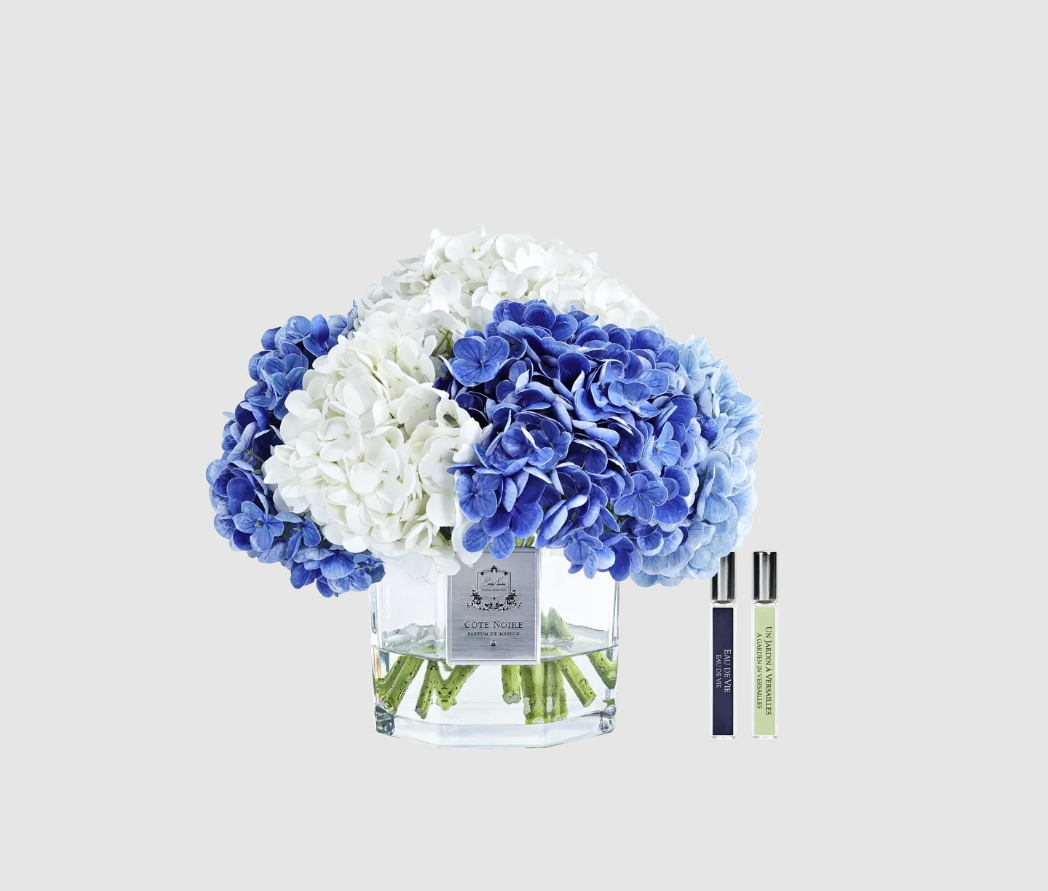 Кожен реалістичний ароматизований букет прованських гортензій майстерно виготовлений вручну та закріплений у водоподібному гелі. Кожна пелюстка має спеціальне натуральне покриття, що надає композиції реалістичного вигляду. Розміщено у розкішній вазі із золотим фірмовим значком Cote Noire.