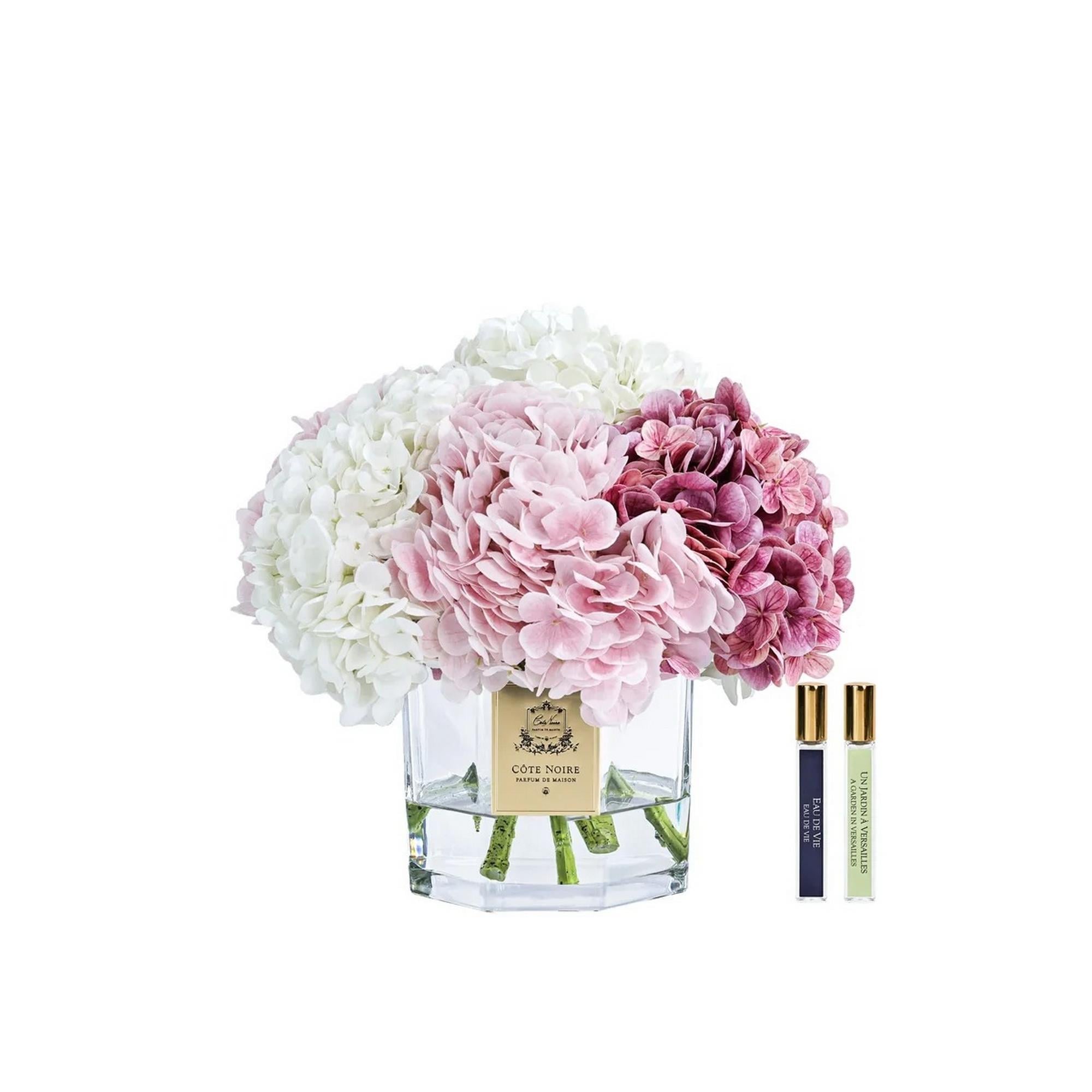 Кожен реалістичний ароматизований букет прованських гортензій майстерно виготовлений вручну та закріплений у водоподібному гелі. Кожна пелюстка має спеціальне натуральне покриття, що надає композиції реалістичного вигляду. Розміщено у розкішній вазі із золотим фірмовим значком Cote Noire.