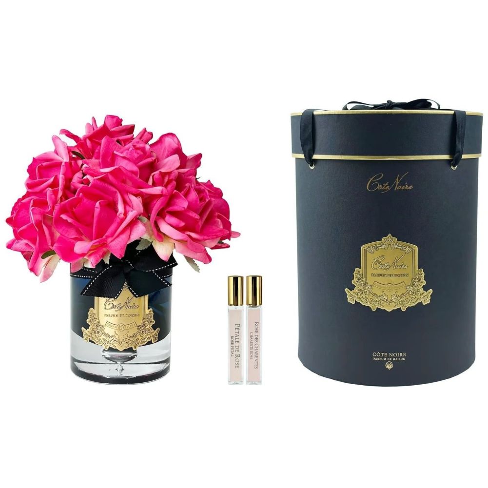 Подарунковий набір Cote Noire - це набір для дому, який складається з парфумованих квітів, представлених у скляній вазі, а також двох парфумованих спреїв. Квіти зроблені вручну та мають вигляд живих, а ваза наповнена гелем, що імітує воду. У комплект входять спреї, які дають змогу за необхідності освіжити та посилити аромат квітів.