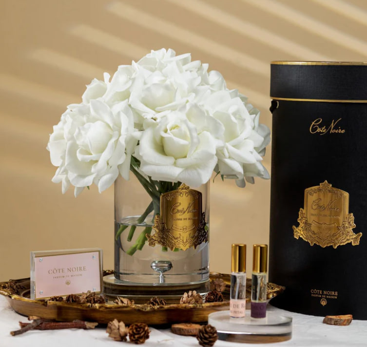 Подарунковий набір Cote Noire - це набір для дому, який складається з парфумованих квітів, представлених у скляній вазі, а також двох парфумованих спреїв. Квіти зроблені вручну та мають вигляд живих, а ваза наповнена гелем, що імітує воду. У комплект входять спреї, які дають змогу за необхідності освіжити та посилити аромат квітів.