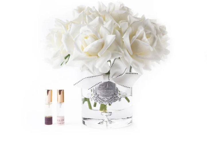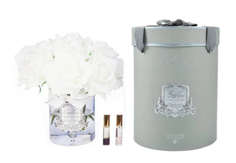 Подарунковий набір Cote Noire - це набір для дому, який складається з парфумованих квітів, представлених у скляній вазі, а також двох парфумованих спреїв. Квіти зроблені вручну та мають вигляд живих, а ваза наповнена гелем, що імітує воду. У комплект входять спреї, які дають змогу за необхідності освіжити та посилити аромат квітів.