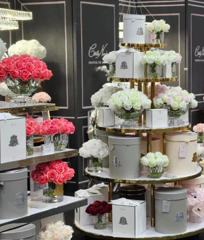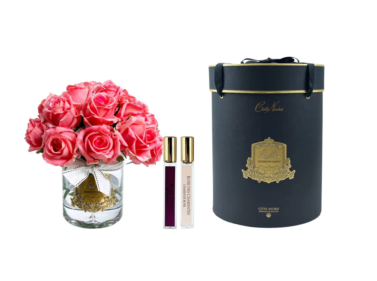 Подарунковий набір Cote Noire - це набір для дому, який складається з парфумованих квітів, представлених у скляній вазі, а також двох парфумованих спреїв. Квіти зроблені вручну та мають вигляд живих, а ваза наповнена гелем, що імітує воду. У комплект входять спреї, які дають змогу за необхідності освіжити та посилити аромат квітів.
