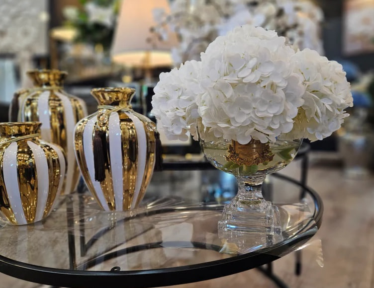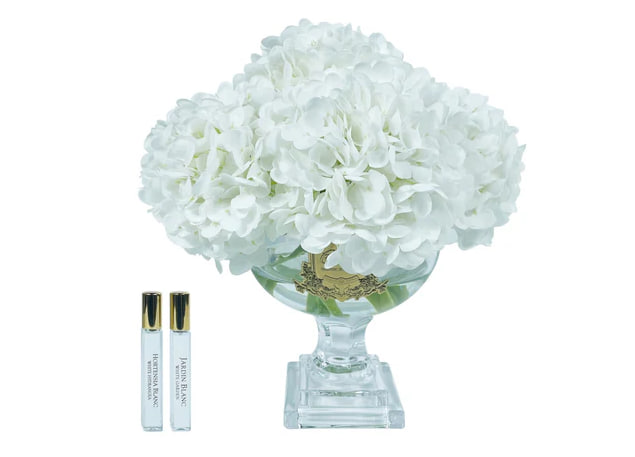 Кожен реалістичний ароматизований букет прованських гортензій майстерно виготовлений вручну та закріплений у водоподібному гелі. Кожна пелюстка має спеціальне натуральне покриття, що надає композиції реалістичного вигляду. Розміщено у розкішній вазі із золотим фірмовим значком Cote Noire.