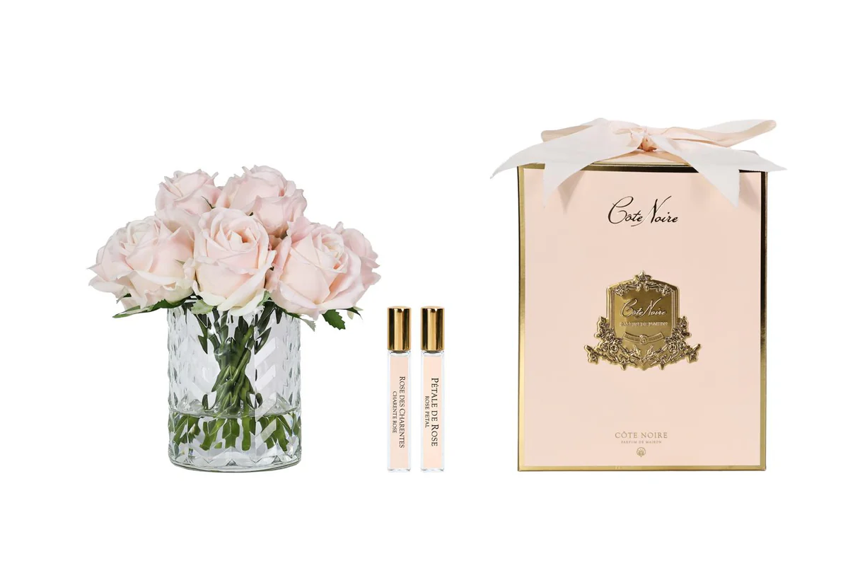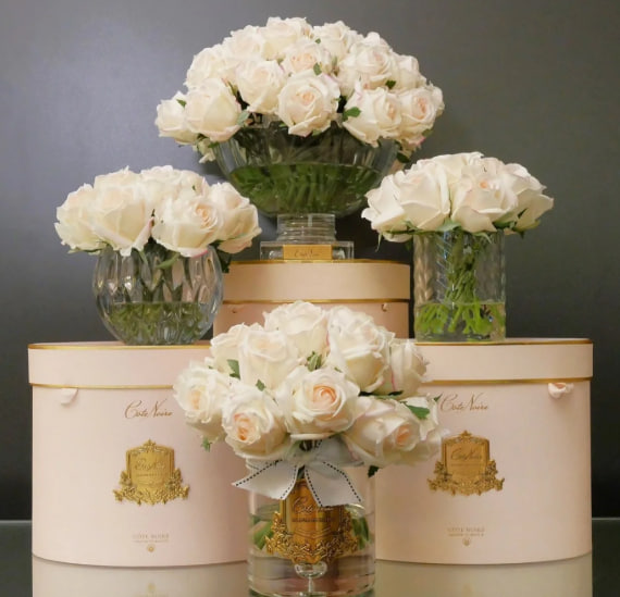 Подарунковий набір Cote Noire - це набір для дому, який складається з парфумованих квітів, представлених у скляній вазі, а також двох парфумованих спреїв. Квіти зроблені вручну та мають вигляд живих, а ваза наповнена гелем, що імітує воду. У комплект входять спреї, які дають змогу за необхідності освіжити та посилити аромат квітів.