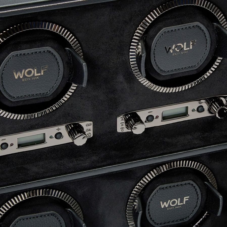 Скляна кришка з замком забезпечує безпечне зберігання, а фірмовий механізм WOLF гарантує точний і дбайливий догляд за годинниками.